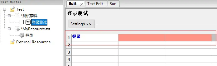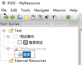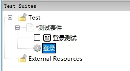 4.此时左边区域会出现“登录”User Keyword,该User Keyword在测试套件下,建议User Keyword放置在Resource下