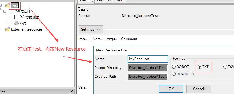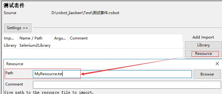 8.导入Resource:在测试套件中导入Resource,才能使用该Resource下的User Keyword(当工作栏区的Resource那一行显示蓝色,说明导入成功,如果是红色,说明导入不成功)
