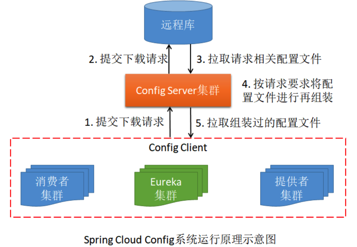 Spring Cloud Config 就是对微服务的配置文件进行统一管理的。其工作原理是,我们首 先需要将各个微服务公共的配置信息推送到 GitHub 远程版本库。然后我们再定义一个 Spring Cloud Config Server,其会连接上这个 GitHub 远程库。这样我们就可以定义 Config 版的 Eureka Server、提供者与消费者了,它们都将作为 Spring Cloud Config Client 出现,它们都会通过连 接 Spring Cloud Config Server 连接上 GitHub 上的远程库,以读取到指定配置文件中的内容。