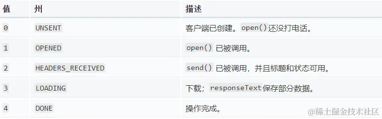 该XMLHttpRequest.readyState属性返回状态XMLHttpRequest的客户端是一个。XHR客户在以下状态中的一种存在: