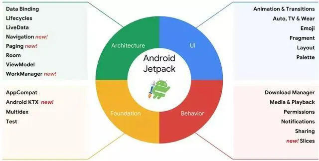 - 谷歌的 AndroidX/Jetpack 库是一组实用工具,旨在简化常见的应用需求。例如用于设备上数据库的 Room,或用来在底层数据更改时更新显示内容的 LiveData。