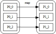 MapReduce 模型将数据处理方式抽象为 map 和 reduce,其中 map 也叫映射,顾名思义,它表现的是数据的一对一映射,通常完成数据转换的工作,如下图所示: