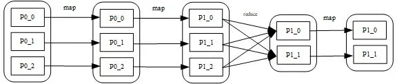 很多支持函数式编程的语言,对于语言本身自带的集合数据结构,都会提供 map、reduce 算子。现在,我们可以很容易的将第一个圆角方框想象成一个数十条数据的集合,它是内存中的集合变量,那么要实现上图中的变换,对于计算机来说,难度并不大,就算数据量再大些,我们也可以考虑将不同方框和计算流程交给同一台计算机的 CPU 不同的核心进行计算,这就是我们说的并行和并发。