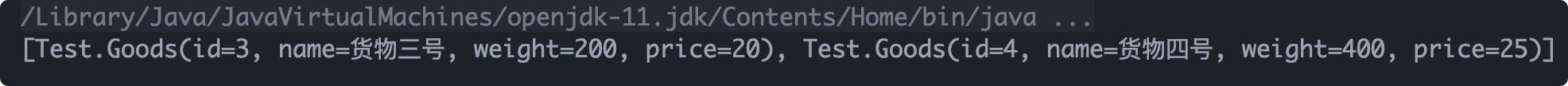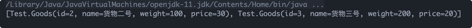 public static void main(String[] args) { List<Goods> goodsResult = goodsList().stream() .filter(goods -> goods.getWeight() >= 200) .collect(Collectors.toList()); System.out.println(goodsResult); }运行结果: