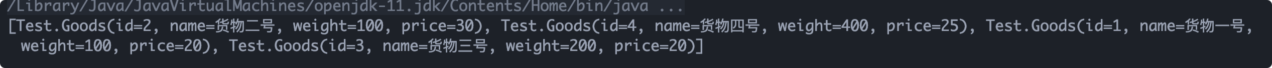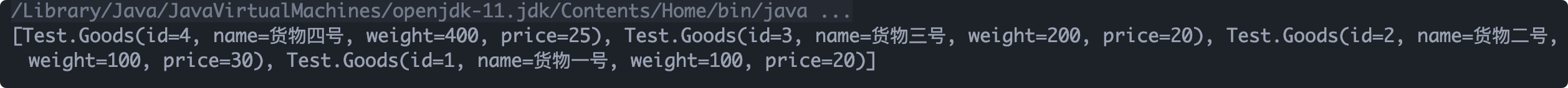 public static void main(String[] args) { List<Goods> goodsResult = goodsList().stream() .sorted(Comparator.comparingInt(Goods::getPrice).reversed()) .collect(Collectors.toList()); System.out.println(goodsResult); }运行结果: