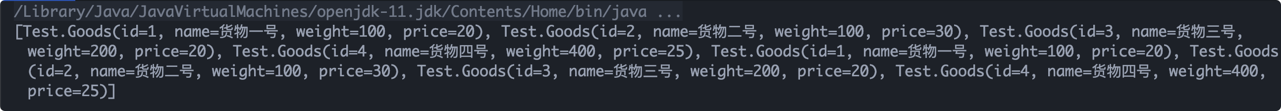 public static void main(String[] args) { List<Goods> goodsList = goodsList(); Goods g1 = new Goods(1, “货物一号”, 100, 20); goodsList.add(g1); List<Goods> goodsResult = goodsList.stream() .distinct() .collect(Collectors.toList()); System.out.println(goodsResult); }运行结果:
