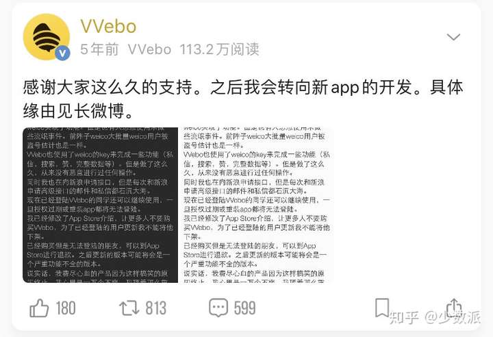 随后的几年时间里,VVebo 只有寥寥几次维护性更新的记录。去年,开发者在微博上宣布 VVebo 已经解决了接口问题,并且会进行重新设计和开发,让一直坚守 VVebo 的用户们看到了希望。