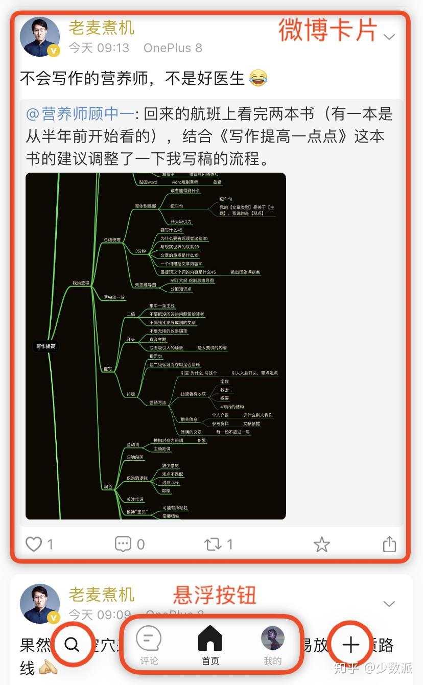 在这次更新中,时间线从列表式变成卡片式,每一条微博都是一张卡片,点击即可展开。底栏也从原来的样式变成了浮动在底部的按钮,搜索和发送按钮被放在两侧,中间则分别是消息(@ 与评论)、主页和个人页。