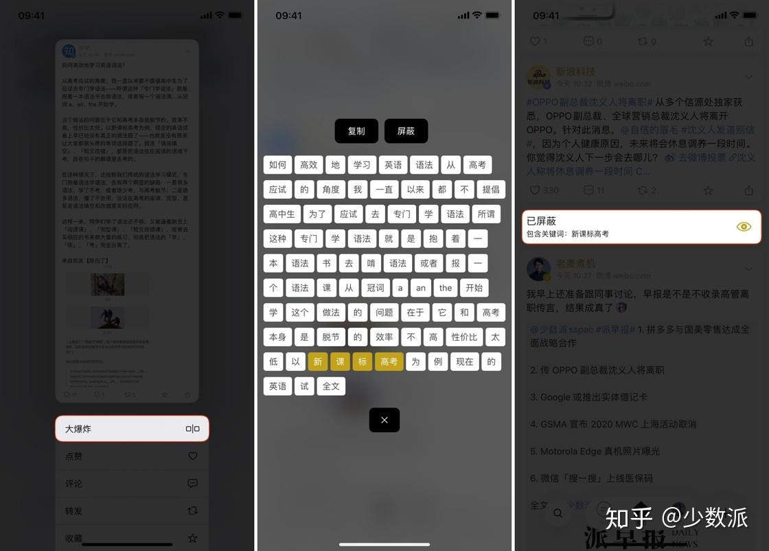 当你长按一条微博时,可以在 Context Menu 里找到「大爆炸」的功能。VVebo 会自动为你删去标点和表情,你可以非常方便地复制自己想要的内容。除此之外,你也可以在「大爆炸」中选择不想看到的关键词进行屏蔽。