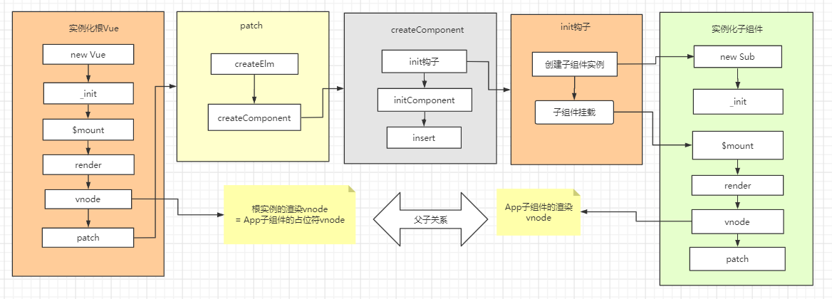 整个初始化是一个深度遍历的过程。在实例化子组件的过程中,它需要知道当前上下文的 Vue 实例是什么,并把它作为子组件的父 Vue 实例。