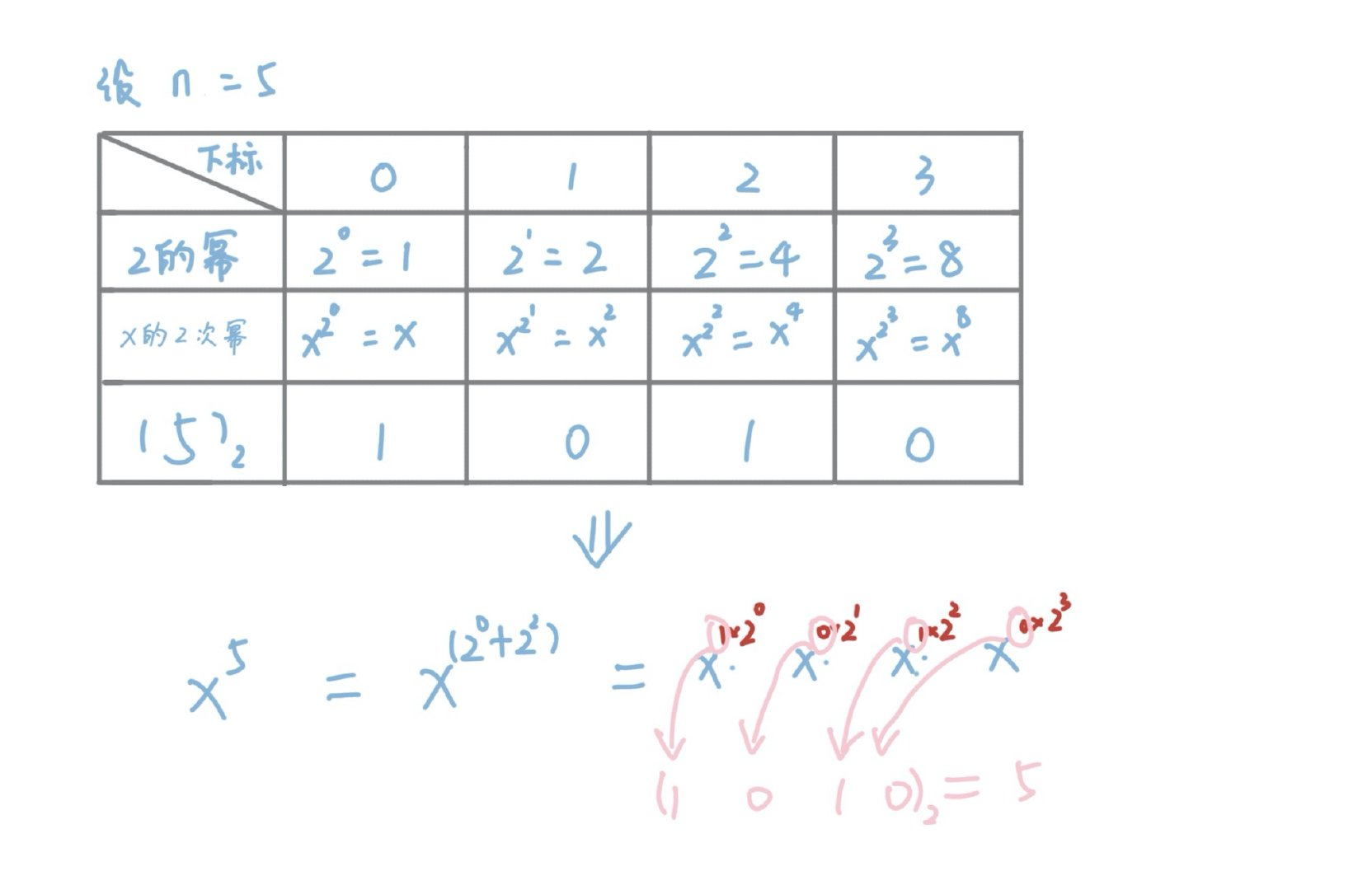 我们先算出所有2的幂,然后在算出所有x的2的幂次方。再把n拆成二进制,把二进制当中对应位置是1的值乘起来,就得到了结果。
