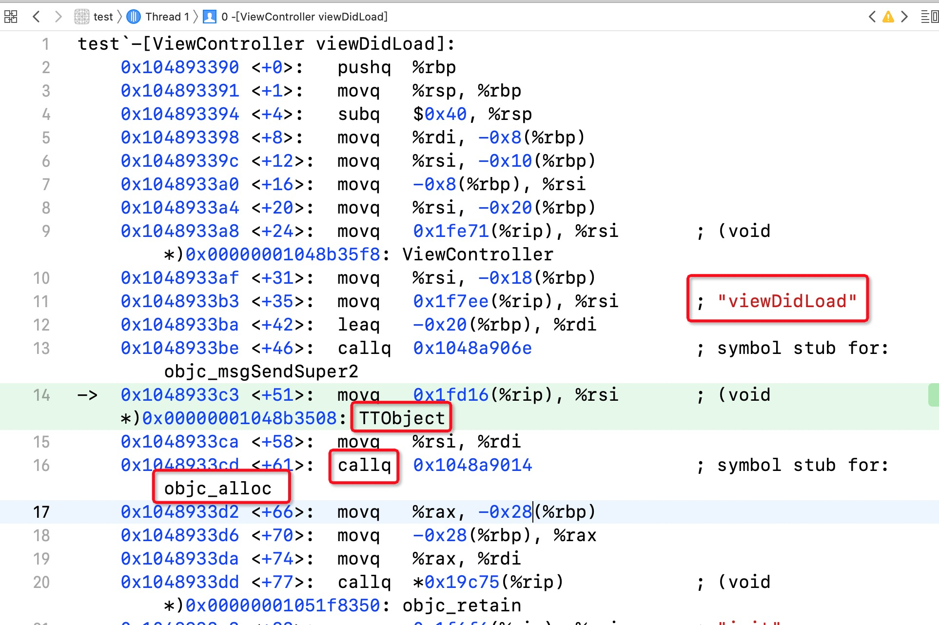 在 viewDidLoad 方法中,[TTObject alloc]这个方法其实是调用了objc_alloc,通过对下符号断点发现objc_alloc存在libobjc.A.dyilb库中。