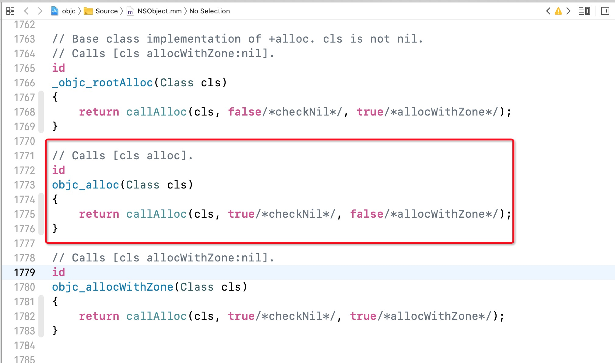 找到objc_alloc函数的实现,我们可以看到alloc相关的方法,其实都调用了一个callAlloc()函数