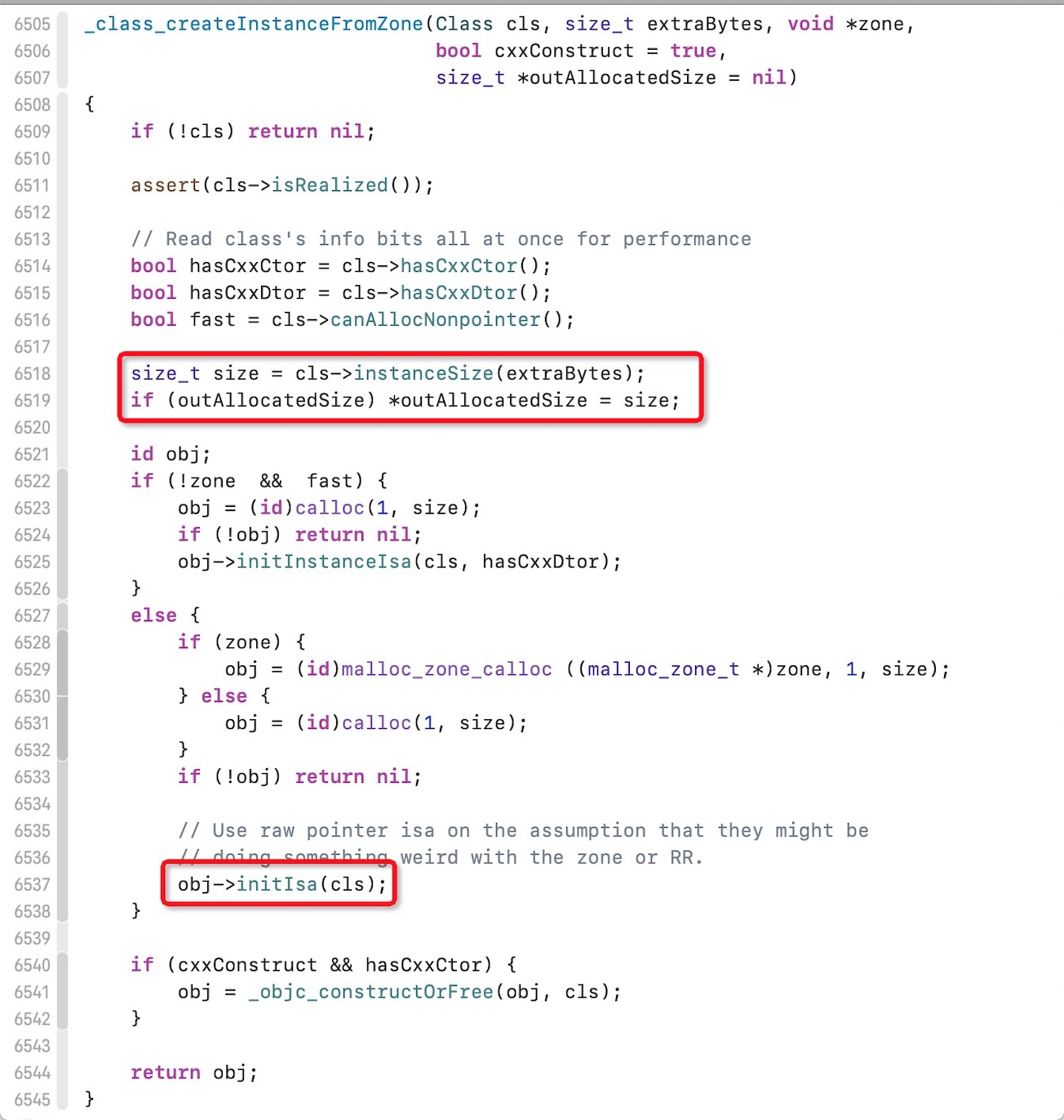 class_createInstance()内部实际是调用了_class_createInstanceFromZone函数。在这个函数里我们可以看到会对obj进行开辟空间以及初始化isa的操作