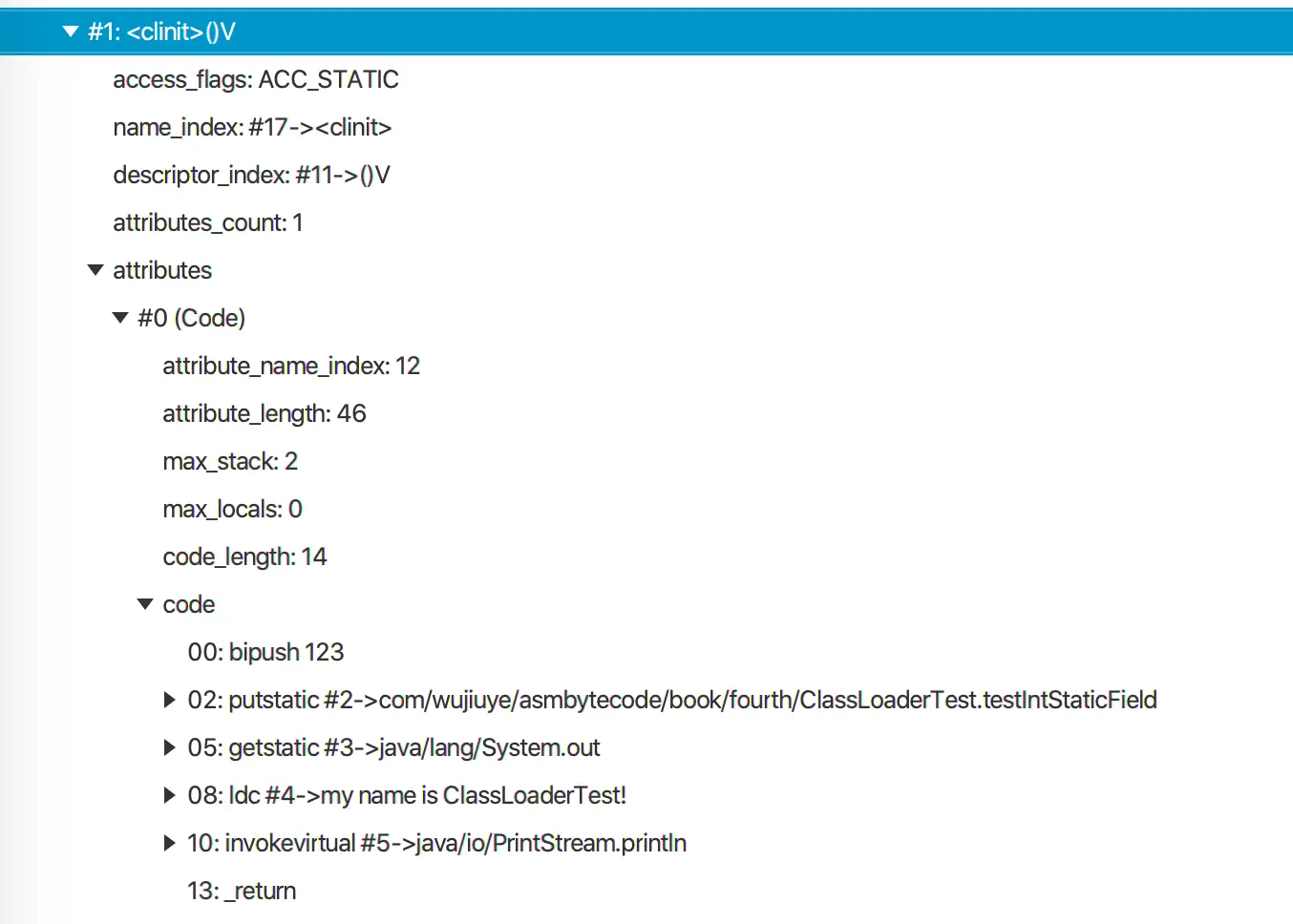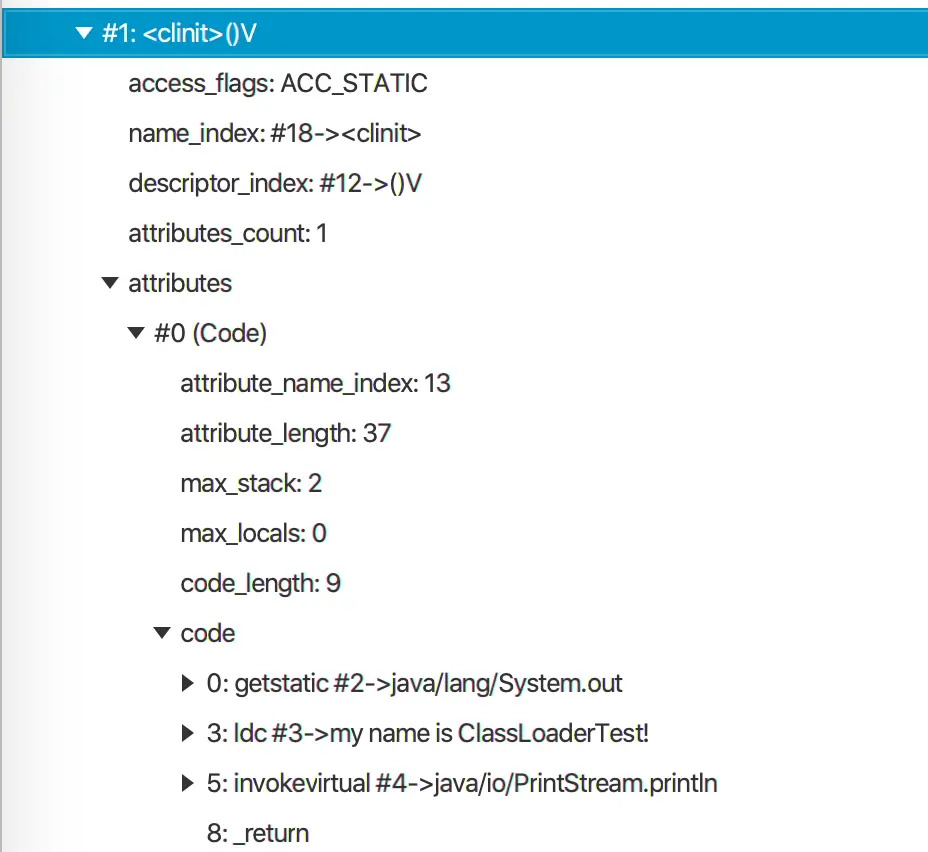 ClassLoaderTest的静态字段testIntStaticField是int类型,编译后可以在<clinit>方法中找到赋值语句。编译后的<clinit>方法代码如下图所示。