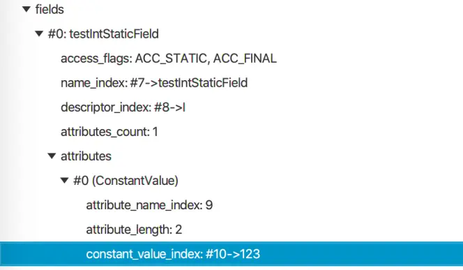 initialize_static_field方法日记打印输出的has_initial_value为1,说明该字段已经存在一个ConstantValue_attribute属性,我们可以使用classpy工具查看,如下图所示。
