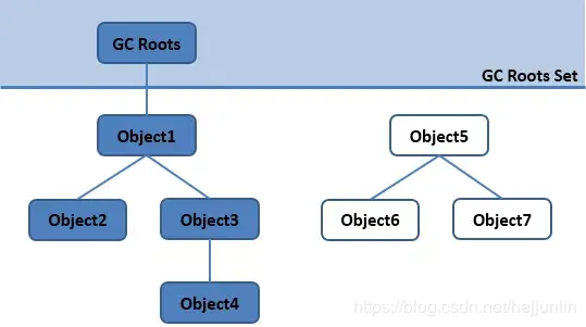 通过一系列称为GC Roots的对象作为起点,然后向下搜索,搜索所走过的路径称为引用链/Reference Chain,当一个对象到GC Roots没有任何引用链相连时,即该对象不可达,也就说明此对象是不可用的,如图:Object5、6、7虽然互有关联,但它们到GC Roots是不可达的,因此也会被判定为可回收的对象。