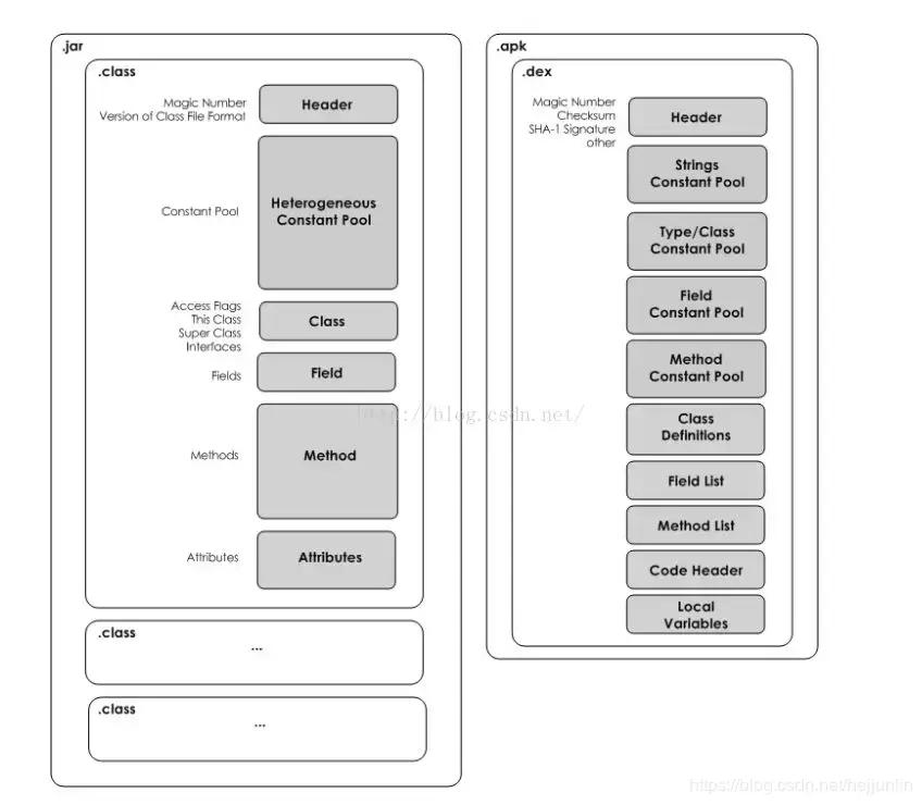 jar由多个class构成,而dex是由多个class合并构成,消除了数据冗余节省了空间,但合并后方法数变多,产生了方法数受限(65535)的问题。