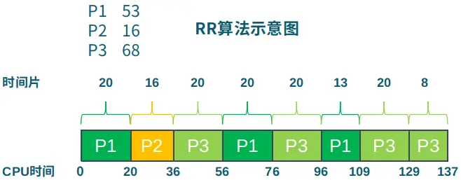 上图是RR算法的示意图,三个进程按照P1、P2和P3的顺序到达,执行时间分别为53、16和68。基准数据如下: