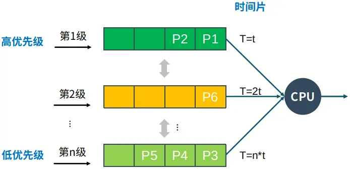 将就绪队列中进程按照不同的优先级分成不同的队列,优先级越高时间片反而越小,进程可以在不同的队列间移动,如进程在当前的时间片没有完成,则降到下一个优先级。