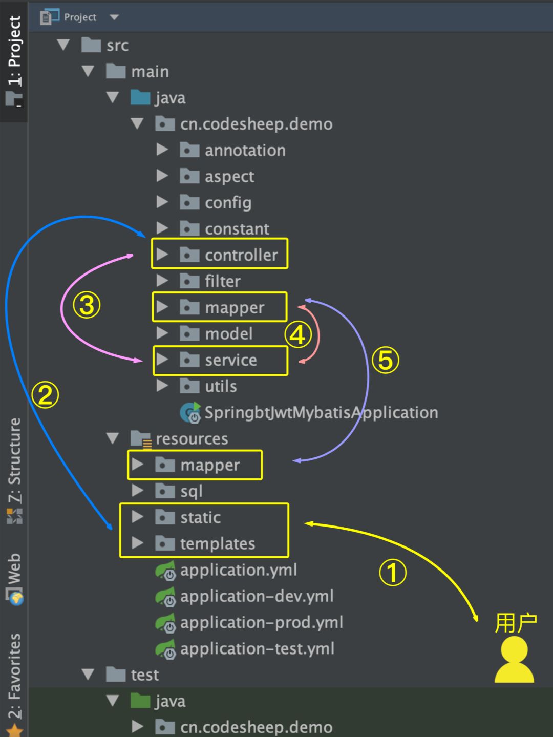 |_mapper:存放mybatis的XML映射文件(如果是mybatis项目)|_static:存放网页静态资源,比如下面的js/css/img |__js: |__css: |__img: |__font: |__等等|_template:存放网页模板,比如thymeleaf/freemarker模板等 |__header |__sidebar |__bottom |__XXX.html等等|_application.yml 基本配置文件|_application-dev.yml 开发环境配置文件|_application-test.yml 测试环境配置文件|_application-prod.yml 生产环境配置文件