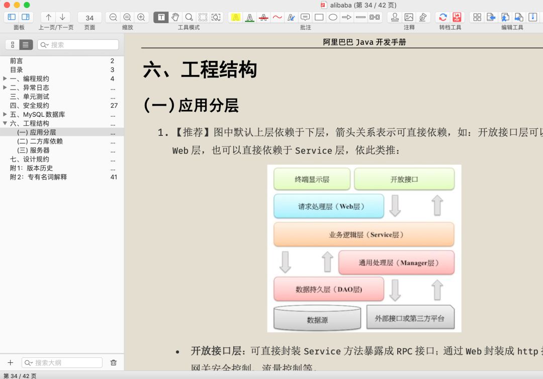 我印象中,以前在看《阿里巴巴Java开发手册》时,好像有关于工程结构和应用分层相关的内容,于是我回翻了一下,果然有:
