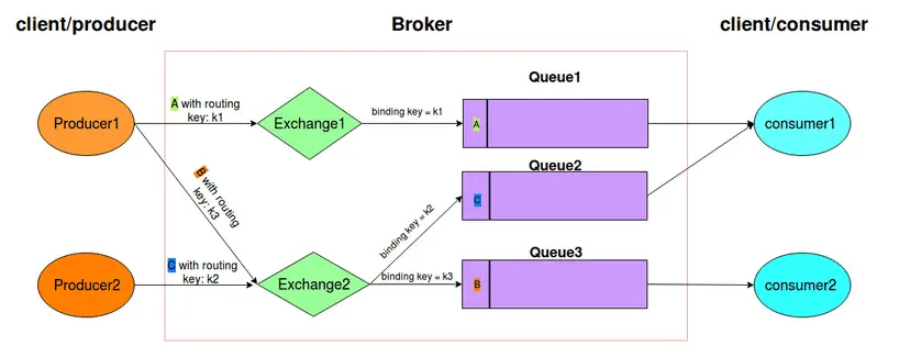- producer客户端使用routing key,在exchange和queue之间建立好绑定关系(即queue binding到一个exchange);