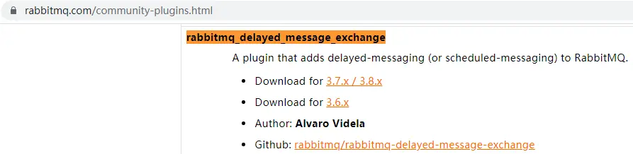上面我分别配置了direct、fanout、topic和custom(x-delayed-message)四种类型的交换器、队列以及绑定。需要特别说明CustomExchange(x-delayed-message)类型RabbitMQ默认是不支持的,需要安装延迟插件,打开官网下载
