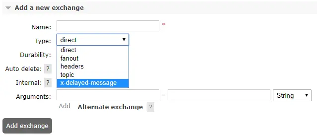 输入命令rabbitmq-plugins enable rabbitmq_delayed_message_exchange 开启插件,此时我们可以到RabbitMQ管理页面查看Exchange,可以看到如下图添加一个Exchange时,可以选择的交换器类型多了一个:
