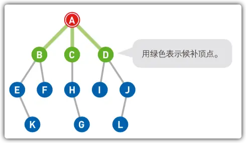 - 此处B、C、D同时称为候补,所以我们随机选择了最左边的顶点B。