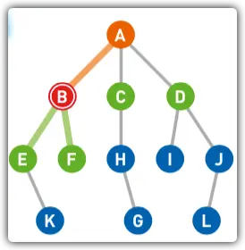 - 将起点移动至顶点B,将B变为红色,同时将已经搜索过的顶点变为橙色。