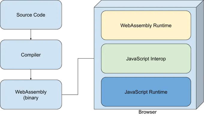 这个文件被加载,同时通过JavaScript互操作层绑定到已存在的JS代码。然后这个.wasm文件将会被WebAessembly运行时执行。
