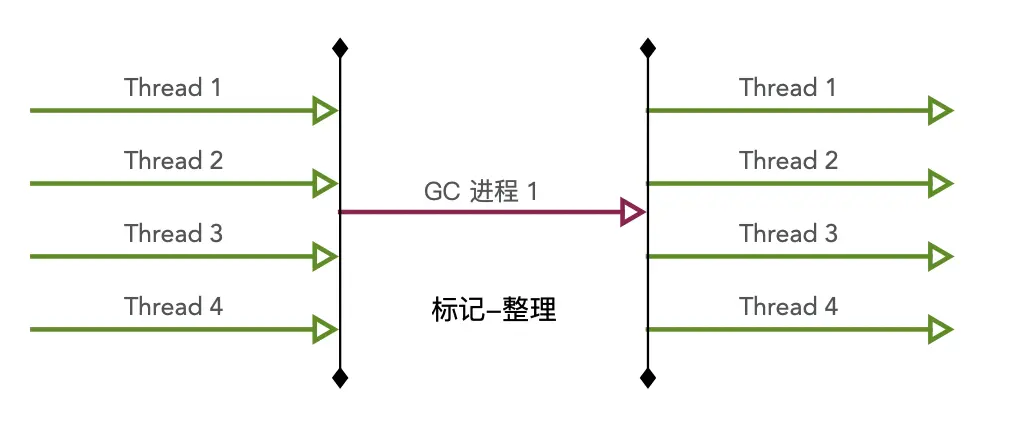 我:没错,Serial 收集器是一款单线程的收集器,它的收集过程也很简单(如下图),虽然它只会使用一个处理器或一条线程去收集垃圾,但是这里我不喜欢称之为单线程收集器,它更适合「串行」这个词,因为它在进行 GC 的时候,必须暂停掉其他的线程(Stop The World,STW)