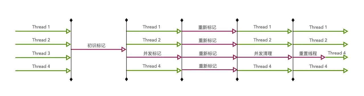我:首先由它的名字我们可以知道,它是基于标记——清除算法的,而它分为了四步走: