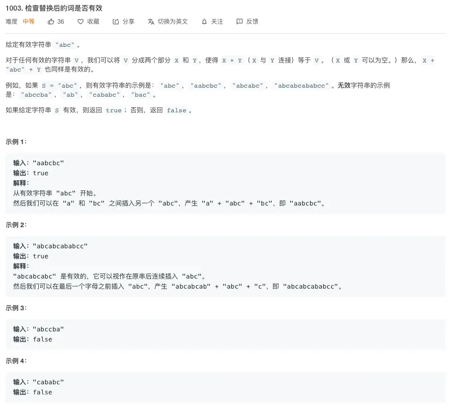 根据题意,不难发现合法的字符串都是在abc的空隙中再插入abc,得出的新字符串中再插入abc。。。 所以用一个栈来存字符a和b,如果碰到c,就pop掉栈顶的两个字符看看c前面的第一个字符是不是b,第二的字符是不是a即可。