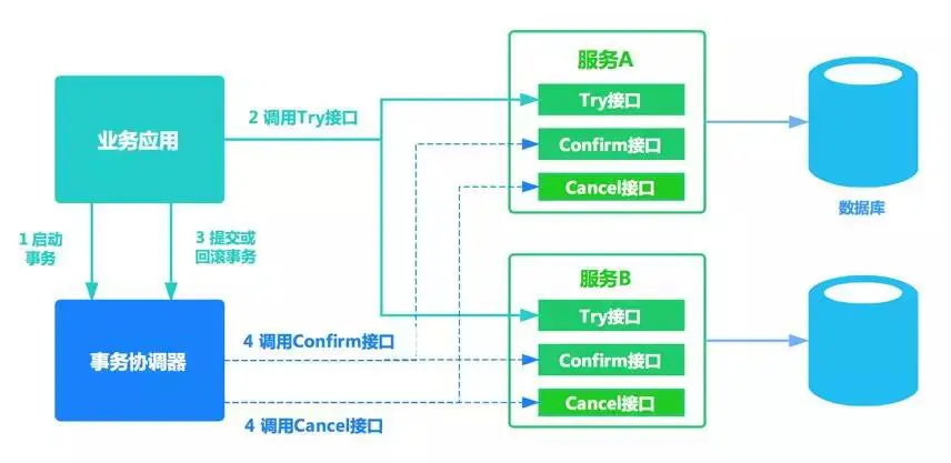 举个例子,假入 Bob 要向 Smith 转账,思路大概是:我们有一个本地方法,里面依次调用 1、首先在 Try 阶段,要先调用远程接口把 Smith 和 Bob 的钱给冻结起来。 2、在 Confirm 阶段,执行远程调用的转账的操作,转账成功进行解冻。 3、如果第2步执行成功,那么转账成功,如果第二步执行失败,则调用远程冻结接口对应的解冻方法 (Cancel)。 Try部分完成业务的准备工作,confirm部分完成业务的提交,cancel部分完成事务的回滚。基本原理如下图所示。