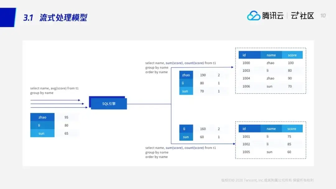 在这个例子里面用户访问的是一个日志表,这个日志表里面有三个列:其中ID是日志的ID,name是用户名,score是用户的历史游戏得分。一个用户会有多个游戏得分,并且他的游戏得分的记录会分散在各个SET上。业务想要获取每个用户的平均分,SQL引擎不能直接把SQL发送给各个SET,所以他需要计算出每个用户的总得分和这个用户在这张表上的一个总记录数,然后用两者的商来求得每个用户的平均分——具体来说SQL引擎要求每个SET返回,每个用户在每个SET上的一个局部的总得分和总记录数。接着SQL引擎将每个SET上返回的结果再进行聚合,得到每个用户的总得分和总记录数,然后再用两者相除。
