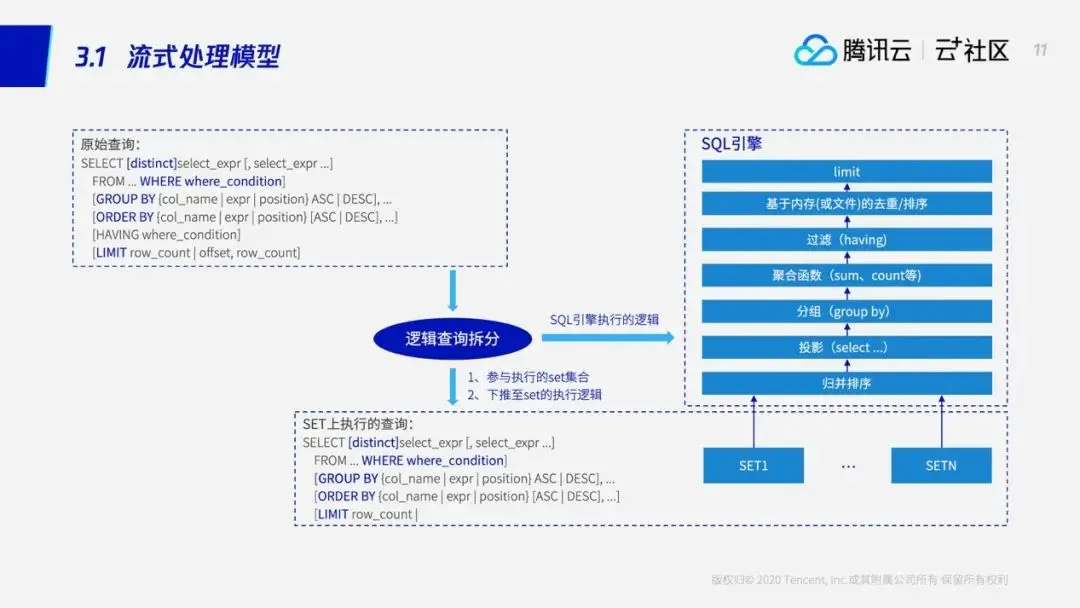 在这个例子中可以看到,SET1和SET2不停地向SQL引擎返回数据,SQL引擎随即对返回的结果进行聚合,并将聚合结果立即返回给这里。整个过程就像流水一样,所以我们将这个过程称之为流式处理模型。流式处理模型最核心的地方就是对SQL进行拆分——拆分成两部分,一个是SET执行的部分,以及在SQL引擎执行的部分。就拿刚刚的例子来说,SET进行一个局部的聚合,计算出每个用户在SET上的局部的总得分和总记录数。SQL引擎进行一个全区的累加和聚合,得到每个用户的总得分和总记录数。进行拆分以后,流式处理模型还会添加一些额外的操作,将两者衔接起来——例如刚刚例子中的order by,这样一来我们就得到了一个流式处理的执行计划。当然除了这个以外,我们还会进行一些优化,将原本分配给SQL引擎的一些操作进行下推,例如模型中的Limit和distinct,其实它应该在SQL引擎上执行的。我们通过把这些下推,能够较大地减少SET返回给SQL引擎的数据量,从而也就提升了整个执行的性能。