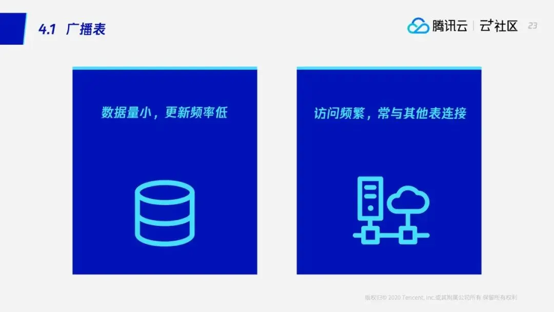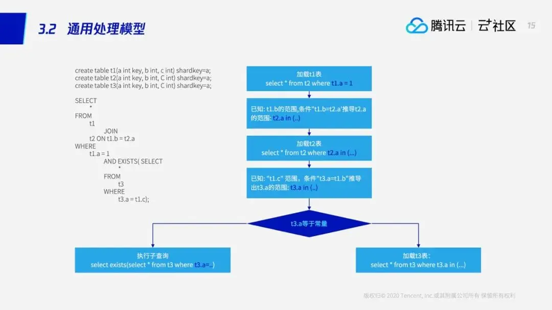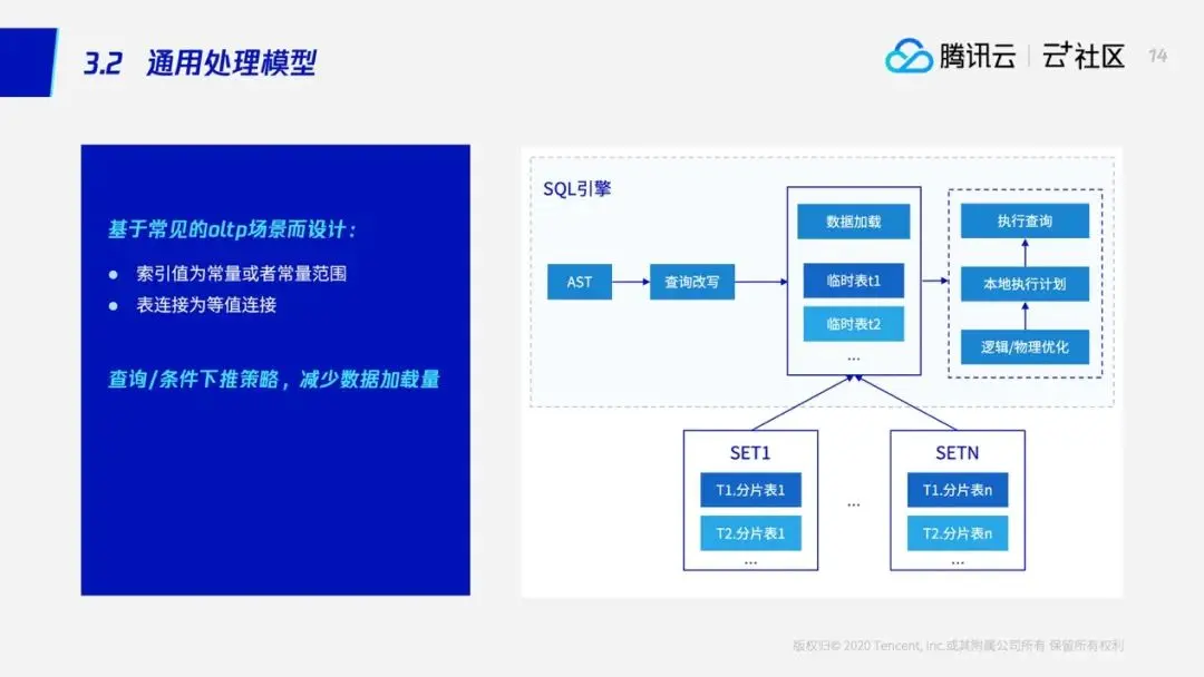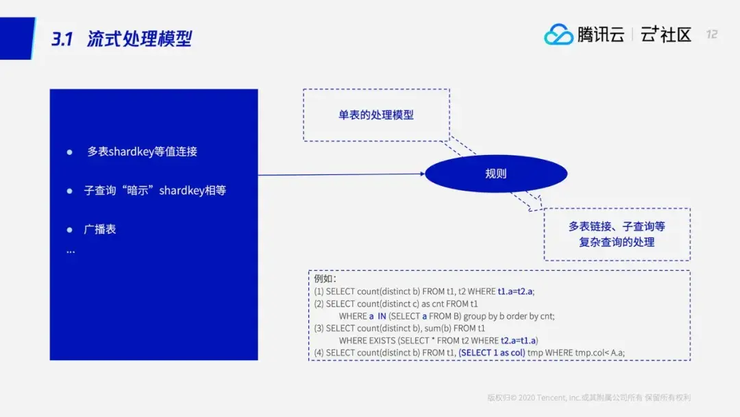 当然,并不是所有的查询都能够满足这样的一个情况,如果两个表不是shardkey相等的话,这个时候我们就需要用后面的通用处理模型进行处理了。但是通用处理模型的性能比不上流式处理模型,那怎样才能够将流式处理模型进行进一步推广呢?TDSQL就引入了一个广播表——广播表的意思就是说将一些表的数据全量备份在每个节点上,这样一来原本T1、T2的关联查询,他们必须用通用处理模型进行处理,这个时候我们也可以使用流式处理模型进行处理了。