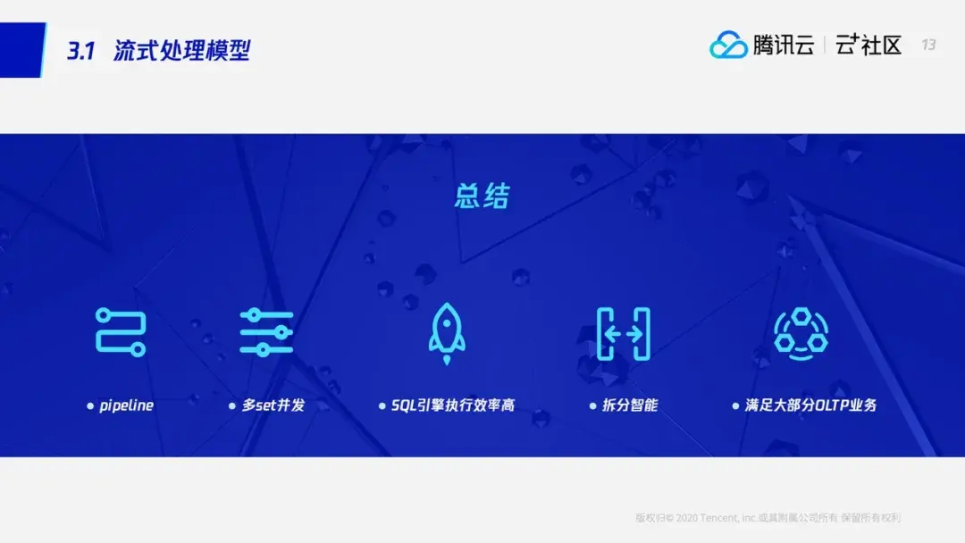 从刚刚的介绍,我们可以看到流式处理模型是以pipeline的方式执行,SET不断返回数据给SQL引擎,SQL引擎不停地对返回的结果进行聚合,并将聚合的结果立即返回给应用。所以说在这种处理方式下,SQL引擎的内存开销是非常低的。同时在执行的过程中,各个SET是并发执行,这也保证了流式处理模型的性能、并行性。流式处理模型最核心的一方就是拆分和下推——通过智能的拆分和下推,我们将大量的计算下推给SET执行,这样就大大减少了SQL引擎需要从SET获取的数据。流式处理模型虽然要求比较严苛,但是我们通过合理的选择shardkey以及引入广播表,事实证明流式处理模型其实能够满足绝大多数的OLTP业务。