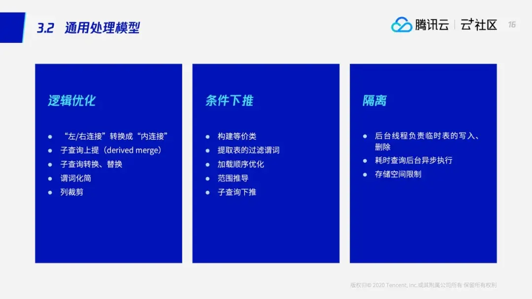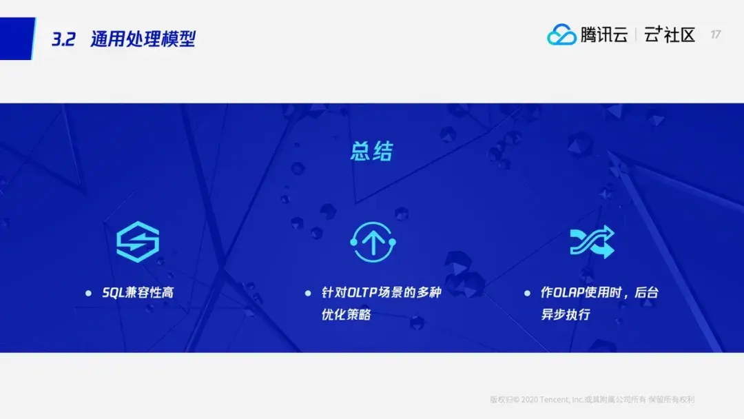 通过前面我们可以看到通用处理模型的SQL兼容性是非常好的,因为我们只需要将数据加载到本地,然后用传统的方法执行这个查询就可以了。然后我们对OLTP场景有很多的优化策略,通过这些策略,我们大大降低了需要加载的数据量。同时,这个通用处理模型也可以作为OLAP来用,如果当做OLAP来用的话,我们会将数据加载和执行这两个比较耗时的动作在后台异步执行。