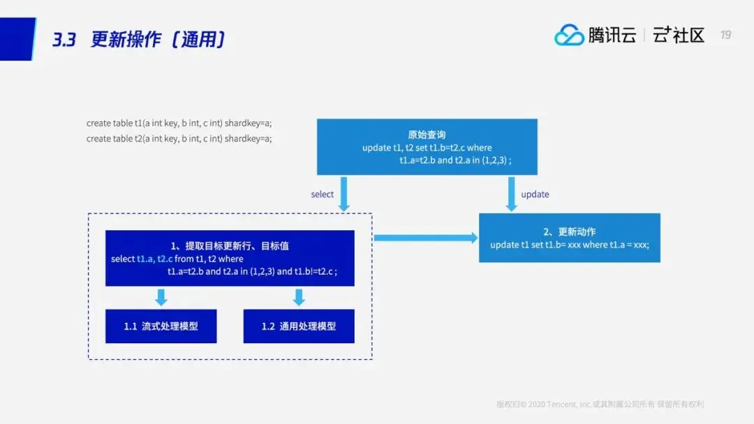 而对于一个比较复杂的更新操作,例如这个例子里面的联合更新SQL。对于这样一个复杂的SQL,SQL引擎会将它拆分成两个部分:一部分是Select,一部分是对应的更新部分。对于这个语句来说就是一条Update。而Select的话,它主要的目的是提取出那些需要被更新行的主键,以及我们需要设置的新值。获取这两个关键信息以后,我们会构建对应的更新操作,因为这个例子里面就是一条Update语句——在这个语句里面我们指定了需要被更新行的主键,同时我们也指定了需要被更新的列和它的新值;然后将这条Update语句发送给对应的SET执行。对于这条Select语句的话,我们就看它的类型,看它是否shardkey相等——如果shardkey相等的话,我们就将由流式处理模型先处理;如果不相等,我们就用通用处理模型先处理。