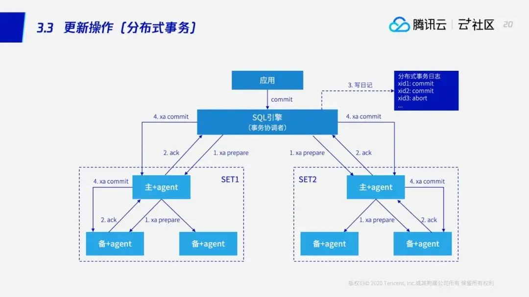 前面我们多次提到分布式事务,在前面的课程中,我的同事也对分布式事务做了一些讲解。这里我们再简要回顾一下。SQL引擎分布式事务所使用的算法是两阶段提交,对应用来说其实不需要关心具体的实现细节,对应用来说就是简单的Commit——当业务发送Commit到SQL引擎的时候,SQL引擎就会向所有的参与者发送prepare,接下来每个收到prepare的主机将这个事务的状态设置成prepare状态,并将这个事务所产生的binlog全部发送给备机。备机收到以后就会再向主返回一个应答,主再向SQL引擎返回一个应答,SQL引擎收到所有参与者的应答之后就会做一个决策。当所有的参与者都应答成功,它就会做一个提交的决策,并将这个决策写入到分布式的事务日志中。一旦写成功的话,我们就可以直接将这个事务提交;而当发生任何一种故障,我们都可以根据这个全局的分布式事务日志进行提交或者回滚。