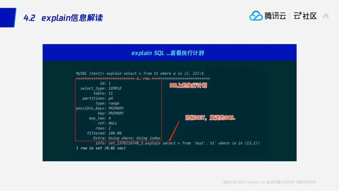在使用MySQL的时候,我们经常使用的命令就是explain,通过explain我们可以看到查询的执行计划,看到这条SQL是否使用了某个索引,或者说多表连接的顺序是否符合预期,SQL引擎也提供了这样一个功能。刚才我们说过一条select语句的执行方式有两种:一种是流式处理模型,一种是通用处理模型。对流式处理模型来说,SQL引擎会拆分成两部分,一个是SET执行部分和SQL引擎执行部分。如果SQL引擎执行的逻辑比较简单,这个时候explain所产生的结果就是SET上的一个实际执行计划,例如对这条SQL来说,其实SQL引擎并没有做什么比较大的计算,所以它产生的结果其实是MySQL上的执行计划。SQL引擎还会追加一些额外的信息,例如可以看到提示用户这条SQL是发给哪个SET的,实际发给SET的是怎样的一条SQL。