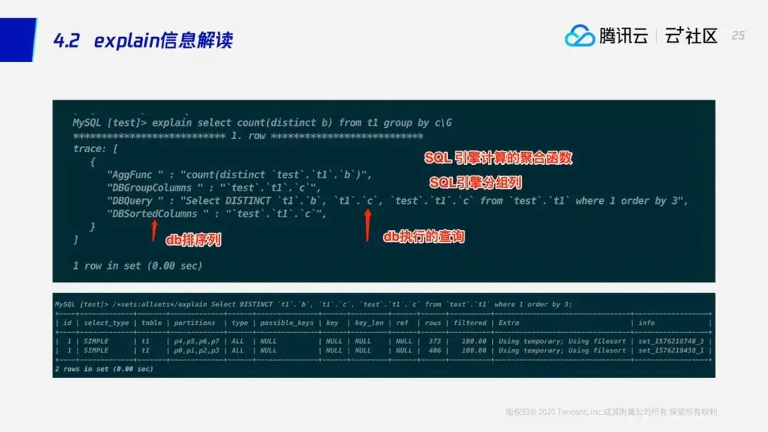 如果SQL引擎对SQL在进行流式处理的过程中进行了比较复杂的聚合,例如——对这条SQL来说,SQL引擎需要计算出count(distinct b),这个时候explain产生的结果就跟前面不一样,explain会告诉用户DB上执行的是什么样的查询,SQL引擎进行怎样的聚合。这个例子里面,我们可以看到DB上执行的是扫描查询,并且下推了distinct,在DB部分进行了初步去重。如果想要知道下推部分的执行计划,我们还提供了透传命令——通过透传命令我们可以看到这条SQL在每个SET上的具体执行计划。这个例子里面,我们可以看到,为了执行这个计划,每个SET使用的临时表,并且进行了一个排序。