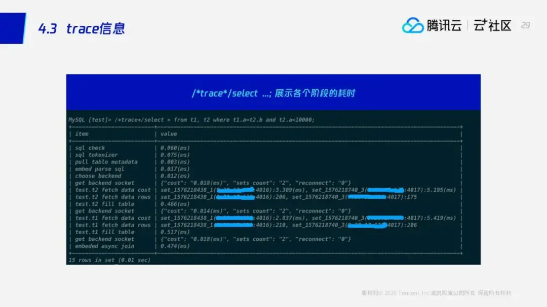 当然光知道一条SQL是怎么执行,有时候还是不够的的。因为影响一条SQL的执行效率可能还跟当前的环境、负载有关系。所以我们想知道一条SQL在实际执行过程中各个阶段的时耗,SQL引擎就提供了这样一个强大的功能——trace。当你在SQL的前面加一个trace前缀的时候,SQL引擎会执行这条查询并记录在执行过程中各个阶段的时耗。例如在这个例子里面,这条SQL是以使用通用处理模型进行处理的,所以在展示的结果里面,我们可以清晰地看到,加载T1时,从SET1和SET2加载数据的时耗,以及SET1和SET2返回的数据量。通过这些信息,我们就可以看到在数据加载过程中的具体细节。如果时耗比较大的话,我们就再去翻看前面的EXPLAIN信息,看看它的下推是否正常,下推之后是否能够使用到索引。通过这些信息我们就可以清楚的看到一条SQL在各个阶段所占用的时间,结合前面介绍的的explain命令,就可以很方便地定位到性能上的瓶颈了。