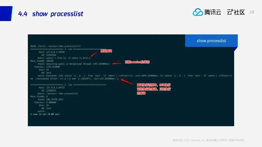 另外我们在MySQL中经常使用的一个命令还有show processlist,这个命令可以看到当前性能中正在运行的一些查询,SQL引擎也同样提供了这个命令。通过这条命令可以看到系统中当前正在运行的查询,通过观察查询执行时从后端DB加载的数据量,以及时耗,我们可以方便地定位到这个系统中哪条查询是资源的消耗大户。show processlist输出中还有一个关键的字段,extra,因为SQL引擎会对用户发送过来的SQL进行拆解,实际发送给DB的SQL跟原生的SQL已经不太一样,extra会展示这些被拆分以后得到的SQL及其实际执行的时间。这样我们就可以将DB上的SQL和当前正在运行的业务SQL结合起来,如果我们发现DB上被某条SQL占用了大部分资源,我们就可以通过这些信息将其与一条业务的SQL进行一个关联。