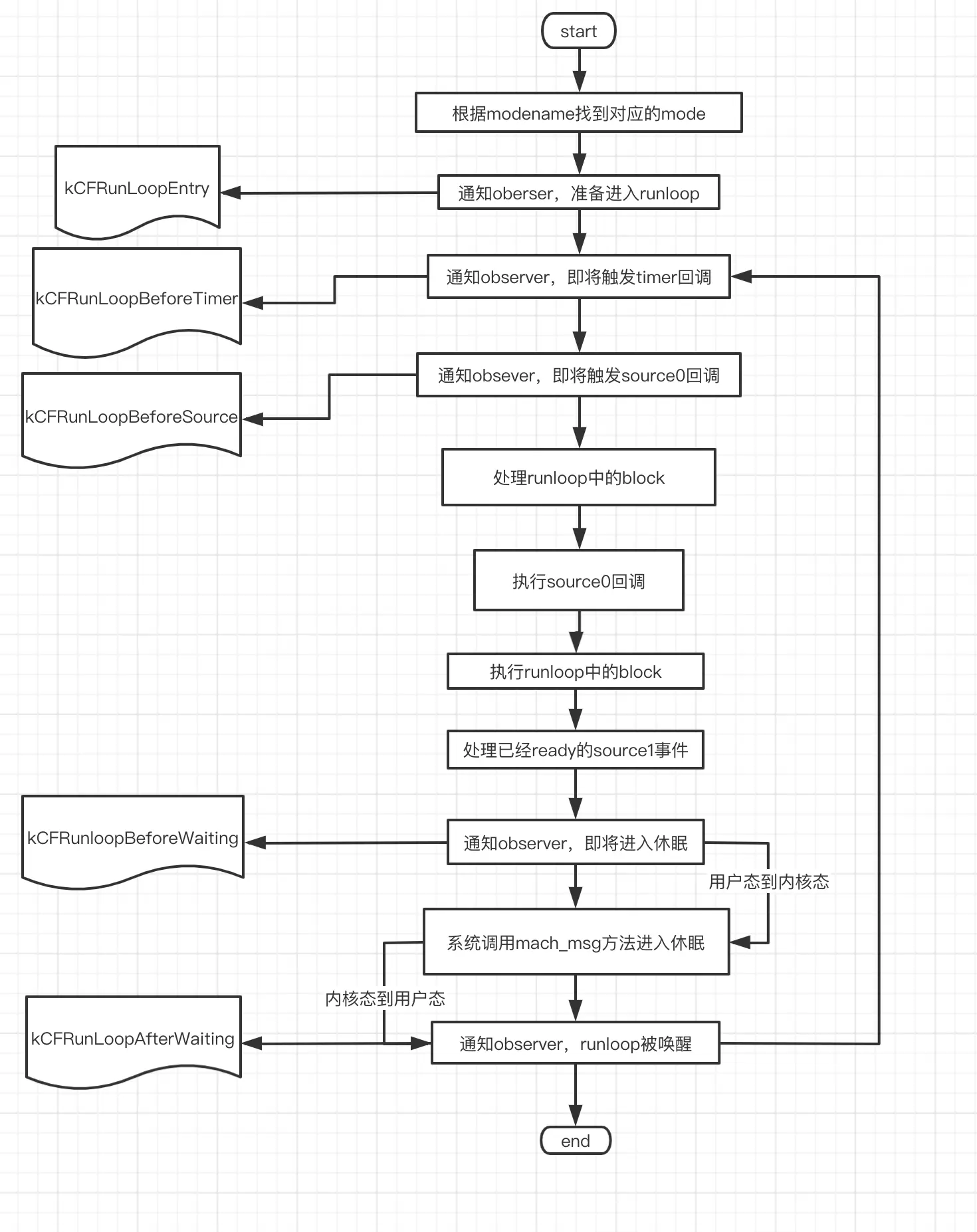 我们都知道了RunLoop是一个死循环,有执行任务,退出和休息三种状态,前两个不必说,休息是一种什么状态呢?解释这个问题前,我们先要知道一个 概念:mach_port,mach是一个内核,提供cpu调度,进程间通信等一些基础服务,在 Mach 中,所有的东西都是通过自己的对象实现的,进程、线程和虚拟内存都被称为”对 象”。和其他架构不同, Mach 的对象间不能直接调用,只能通过消息传递的方式实现对象间的通信。”消息”是 Mach 中最基础的概念,一条消息中包含当前端口 local_port 和目标端口 remote_port,消息在两个端口 (port) 之间传递,这就是 Mach 的 IPC (进程间通信) 的核心。消息的发送和接收使用<mach/message.h>中的mach_msg()函数,而mach_msg()的本质是一个调用mach_msg_trap(),这相当于一个系统调用,会触发内核状态切换。让程序处于休眠状态。而这个状态就是:APP依然在内存中,但不在主动申请cpu资源(此处不要较真,肯定不是完全不用cpu的),然后一直监听某一个端口(port),等待内核向该端口发送消息,监听到消息后,从睡眠状态中恢复(重新启动RunLoop的循环,处理完事件后继续休眠)