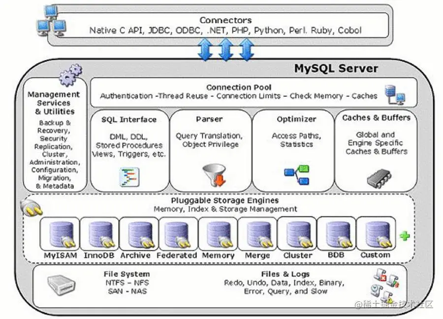 来看看MySQL数据库的体系结构,其结构如图所示(摘自MySQL官方手册)。