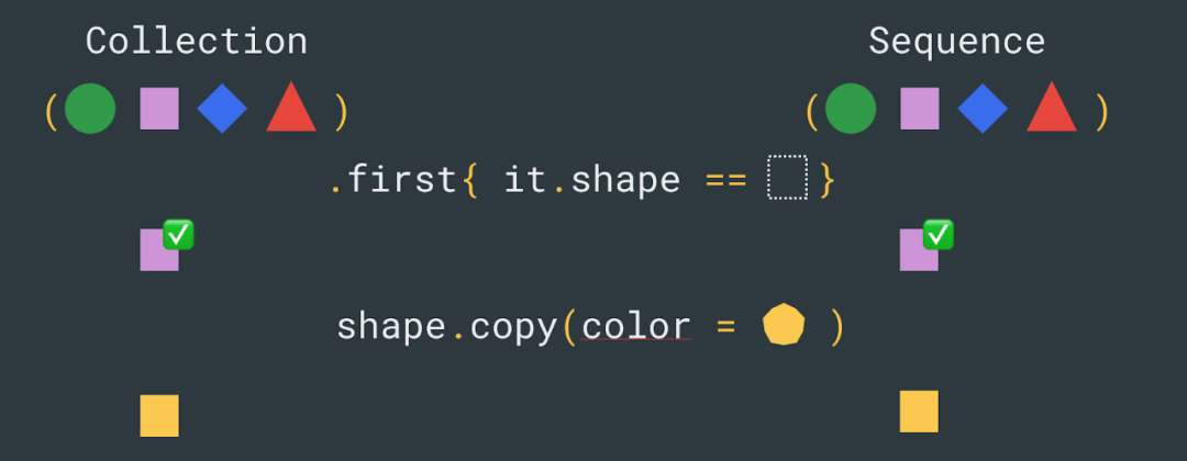 无论您使用 Collection 还是 Sequence,转换的顺序都很重要。在上面的例子中,first 不需要先在 map 之后进行操作,因为 first 不需要 map 操作的结果就能够执行。如果我们颠倒业务逻辑的顺序,先把 first 作用到 Collection 上,再对结果执行转换,那么我们只会创建一个新的对象 —— 一个黄色的正方形。当使用 Sequence 时,会避免创建两个新对象,而当使用 Collection 时则会避免创建整个列表。